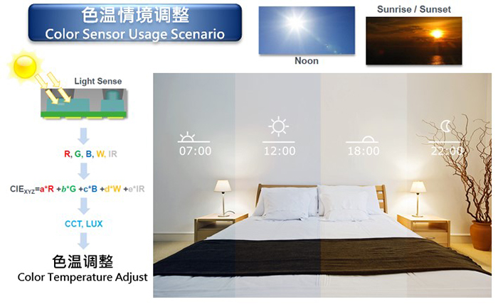 色溫調節照明主要是利用R/G/B傳感器依不同時間段的日光色溫調整室內的照明色系,
