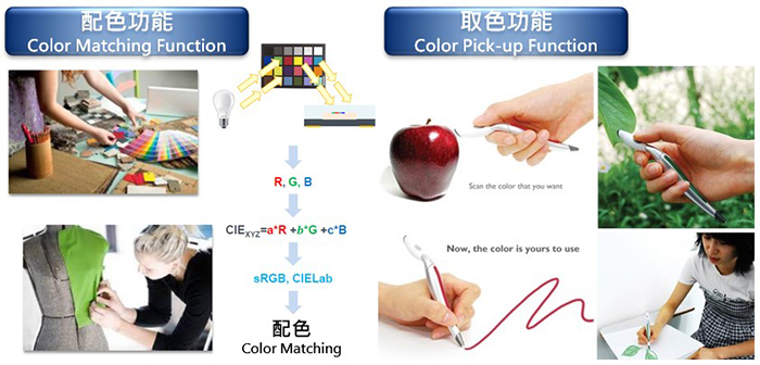 色彩搭配應用主要為配色取色與配色,應用原理主要是利用R/G/B傳感器對目標物進行CIE定義的R/G/B對應值演算判定出顏色,