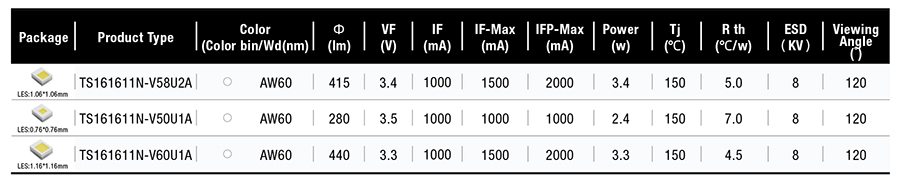 TS161611N-V50U1A LES:0.76*0.76mm / TS161611N-V58U2A LES:1.06*1.06mm / TS161611N-V60U1A LES:1.16*1.16mm