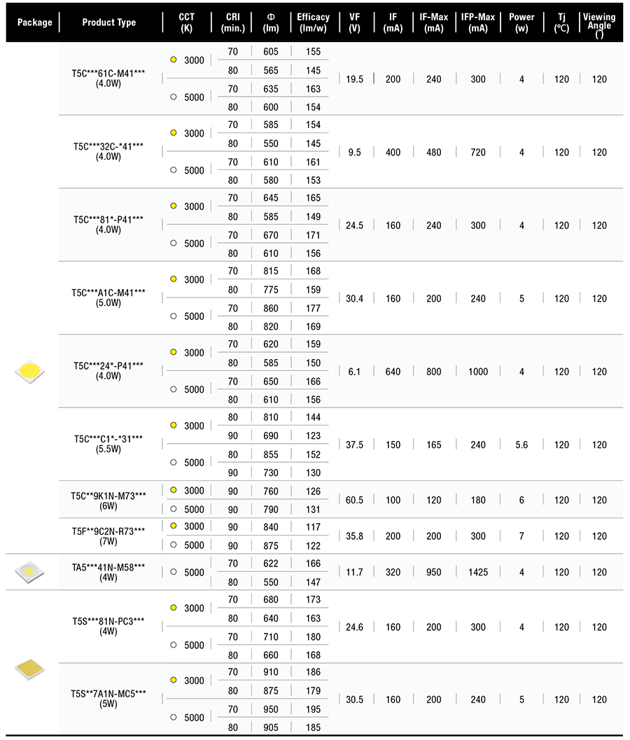 • 高可靠性EMC封装产品,完美平衡光效,可靠性,照明质量及综合成本优势