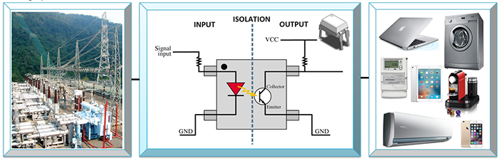 光耦元件于输入端由电讯号转为光讯号,输出端则吸收光讯号后转换为电流/电压;