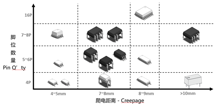 因应不同的安全规范需求,使用者会挑选不同爬电距离的光耦;因应不同的功能需求,