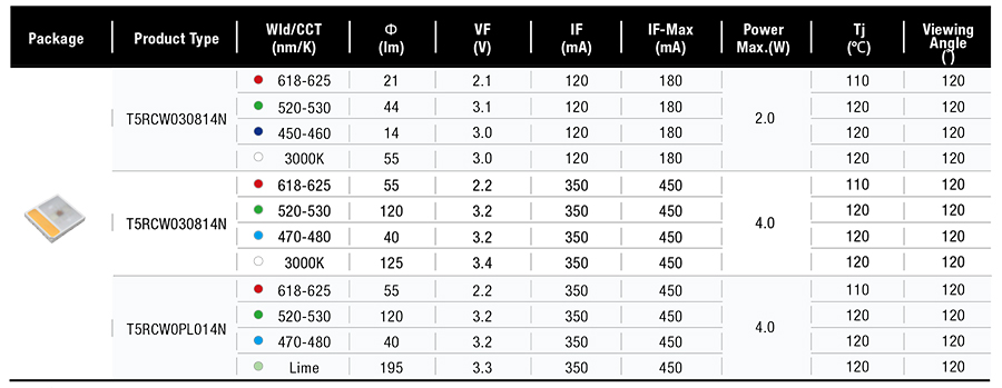 产品特性:• 高耐热EMC封装• 紧凑的封装尺寸规格• 低热阻• 耐高电流驱动