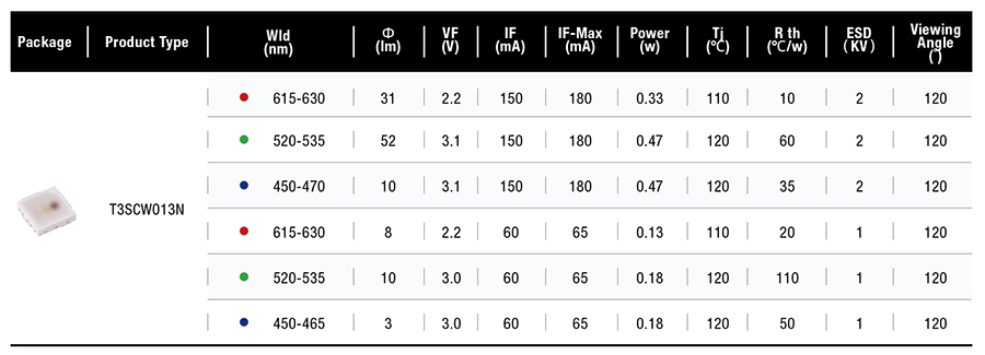 产品特性:• 高耐热EMC封装• 紧凑的封装尺寸规格• 低热阻• 耐高电流驱动